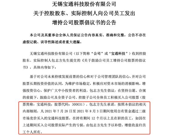 包志方承诺,按照本倡议的相关内部细则,凡2021年7月28日至2021年8月3日期间使用自有资金通过二级市场竞价买入的宝通科技股票,持有12个月以上且在职的员工,如因在上述期间买入公司股票实际产生的亏损,由包志方予以补偿,增值收益归员工个人所有。