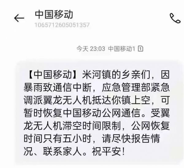 在此次的河南救灾活动中也能发现无人机的身影,在一些内涝严重的城市,通讯信号与电网失常,救援设备及人员无法快速抵达前线,被困者面临物资短缺、与外界失联的生存危机,无人机作为应急通信保障发挥作用。翼龙-2H应急救灾型无人机系统是航空工业为应急管理部打造的应急通信国家力量,可定向恢复50平方公里的移动工网通信,供受困群众报备现场状况、联系家人报平安。