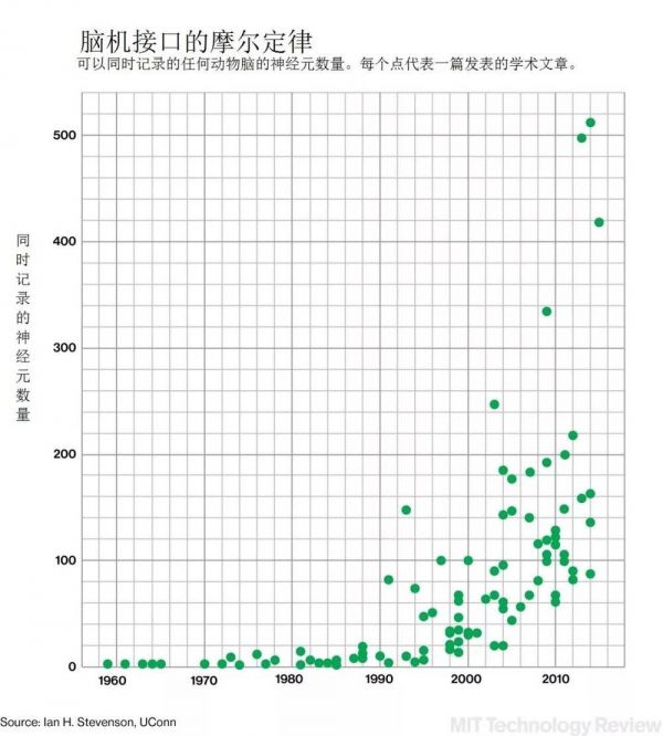 不管脑机接口领域里等同于“集成电路”的技术究竟是什么,它现在还没出现,因为7.4年这个翻倍速度太慢,不足以掀起一场革命。这里提到的突破不是那个能够同时记录一百万个神经元的设备,而是能够让发展速度更匹配摩尔定律而不是史蒂文森定律的范式转变。一旦这个范式转变发生了,能记录一百万神经元的设备自然会到来。