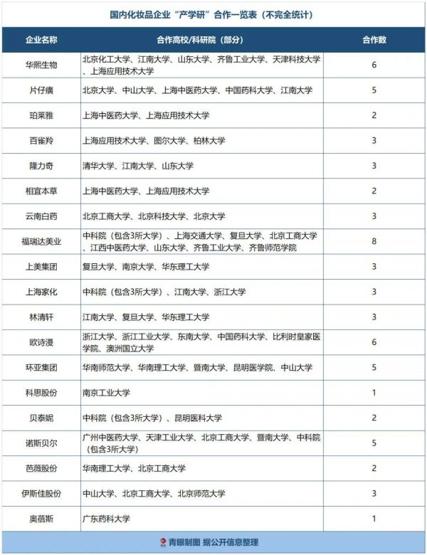 从高校来看,同时与多家化妆品企业合作已不足为奇,江南大学就与华熙生物、片仔癀、隆力奇、林清轩等多家企业开展“产学研”合作;上海应用技术大学也与华熙生物、珀莱雅、百雀羚等企业展开广泛合作。