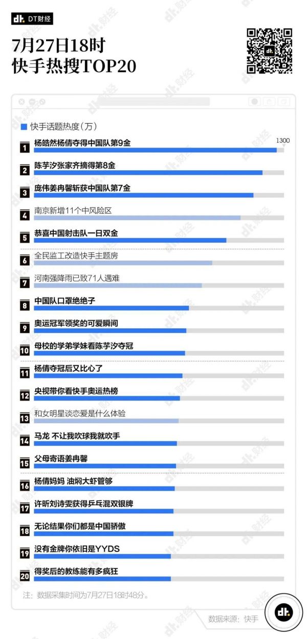 欢天喜地,如果你27日也在关注快手的话题榜,大概也会有这样的感觉。7月27日18时48分,快手的TOP20的话题中有16条奥运内容,而且这16条内容中有多条夺冠后的庆祝信息,喜庆浓度直逼春晚。