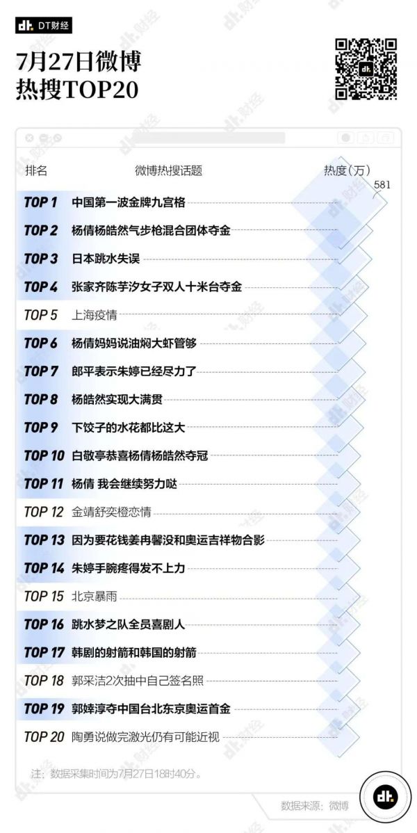 7月27日18点40分的微博热搜榜上,TOP20的热搜里有15条与奥运有关,“含奥量”高达75%。