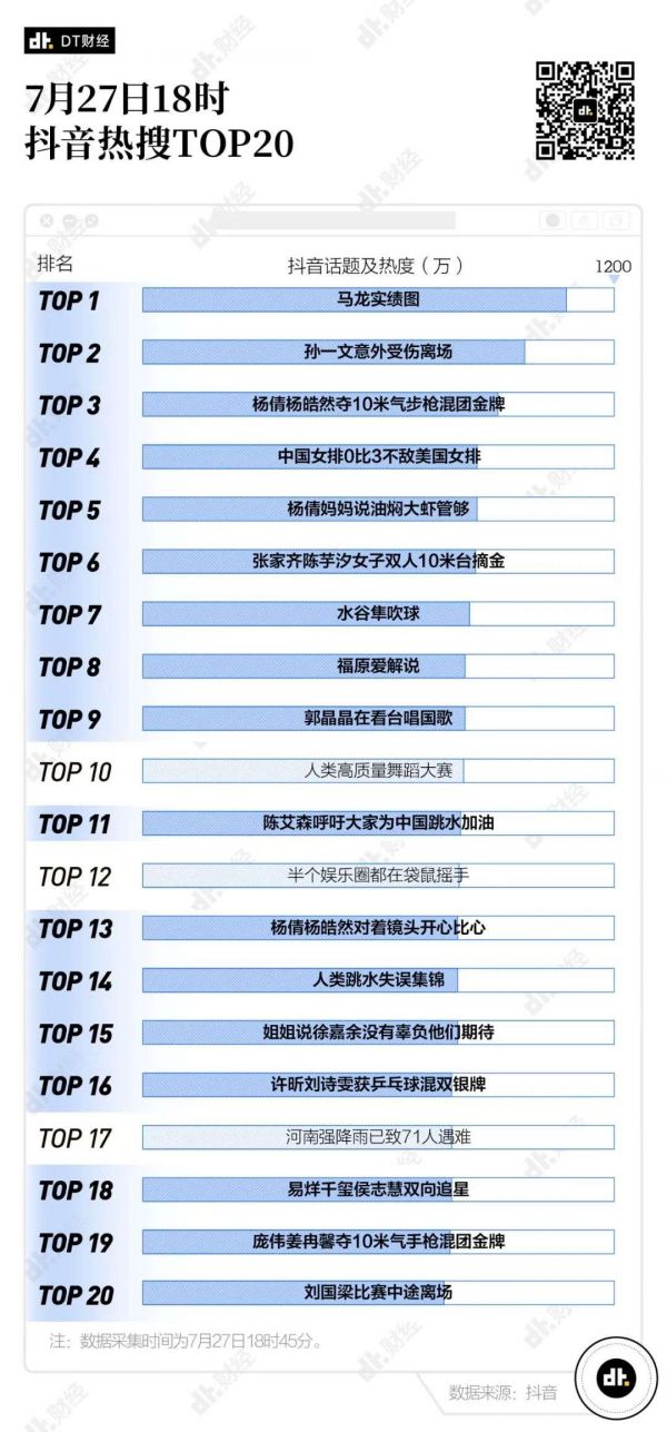 从7月27日晚间18时45分的抖音热榜来看,抖音关注的奥运话题更多聚焦在个体。