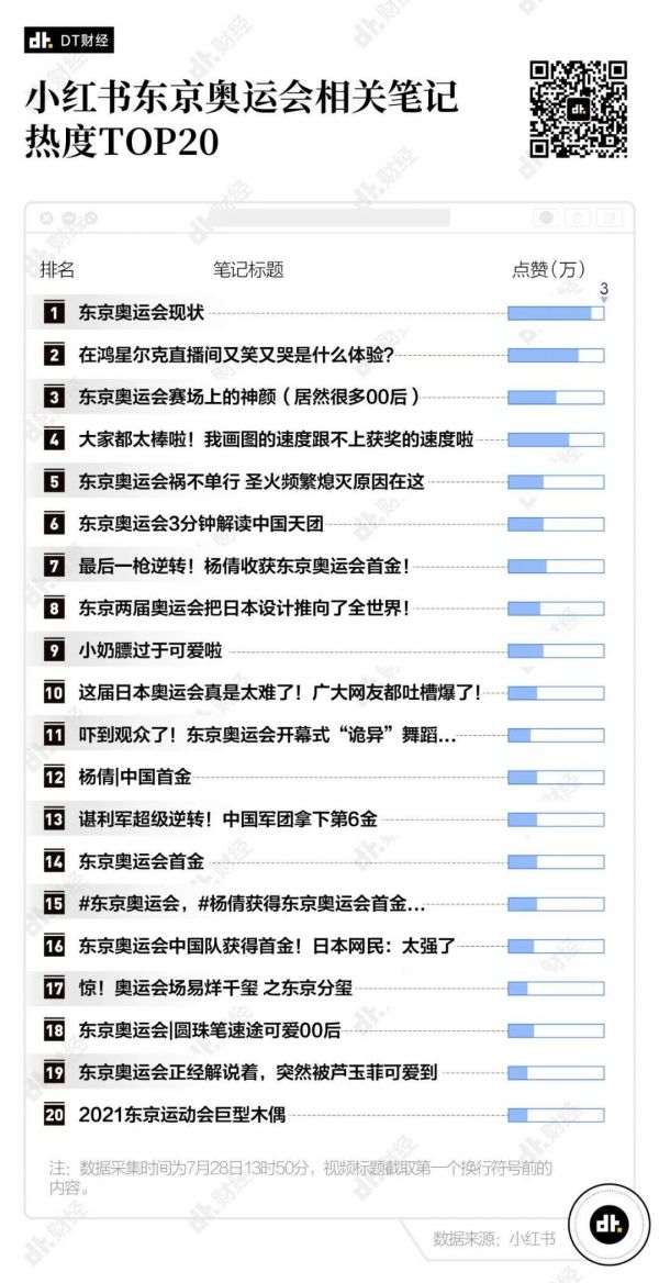 7月28日13时50分,我们在小红书上搜索“东京奥运会”,并按热度降序选出了目前为止热度最高的20条相关笔记。