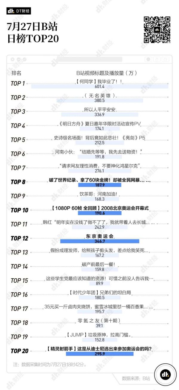 从7月27日晚间B站的热榜内容来看,奥运会在B站的影响力不算太大,TOP20的内容当中只有4条与奥运相关,而且排名最高的一条也只排在第8位。