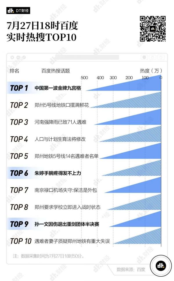 截至7月27日18时,百度TOP10话题当中只有3个奥运相关,其他都是时下热门的社会议题。