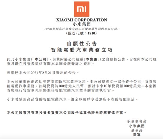 据小米集团公告,小米董事会已批准智能电动汽车业务立项,将为此成立一家全资子公司,关键词在全资。雷军表示,有投资人得到小米造车的消息之后迅速跑来接洽,其中不乏投资大佬,但考虑到与手机、生态链产品全部打通才能给到用户最好的体验,小米决定自己做,就像当年的手机业务一样。