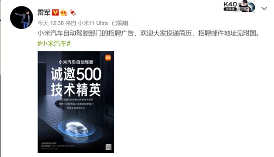 这是继3月30日晚,小米集团在港交所发布宣布小米智能汽车业务正式立项后,首次大张旗鼓的招兵买马。在雷军的微博下面,网友调侃道:“真·boss直聘”。