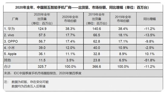 根据IDC中国季度手机市场跟踪报告,2020年国内手机市场整体出货量约3.26亿台,同比下降11.2%。尽管小米在2020年的市场占有率从2019年的10.9%略微增加到12%。受国内手机市场大环境的影响,尽管小米在2020年总的国内出货量是下降的,但其下降幅度相比其他三家头部大厂是最轻微的:只有区区约1百万台的下降。