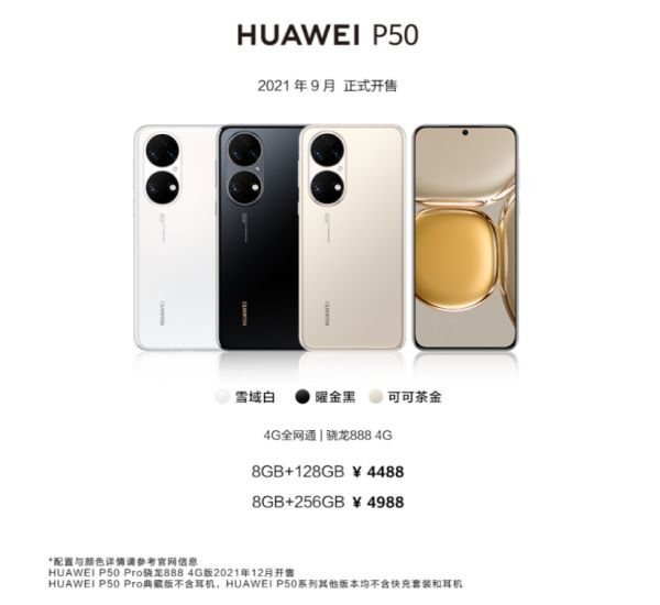 华为P50将于2021年9月正式开售,8GB+128GB售价为4488元,比P40贵300元。8GB+256GB售价为4988元。