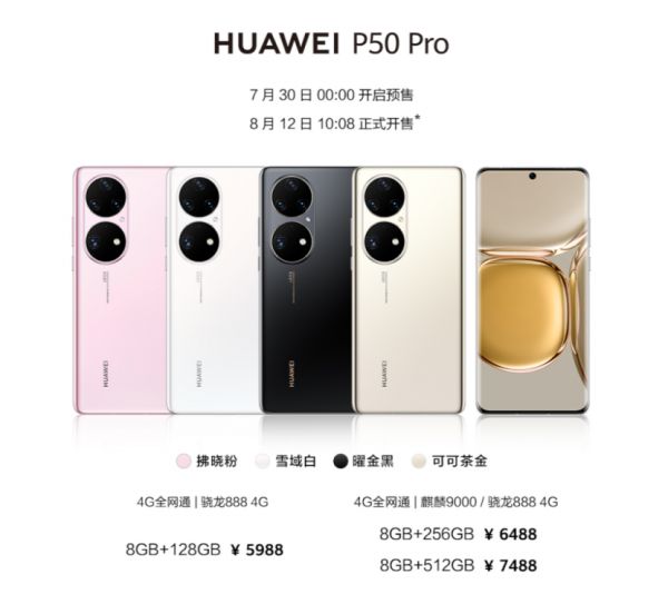 P50 Pro(麒麟9000),8GB+256GB售价为6488元,8GB+512GB售价为7488元。P50 Pro(骁龙888 ),8GB+128GB售价为5988元,8GB+256GB和8GB+512GB版本的售价与P50 Pro(麒麟9000)一致。