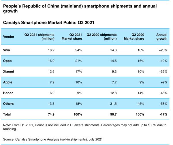 去年以来,受芯片短缺问题影响,华为手机出货量大幅减少。国内手机厂商小米、OPPO、vivo等对“空缺市场”展开了疯狂争抢。根据第三方市场调研机构Canalys 的最新数据,第二季度,中国智能手机市场出货量排名前五的厂商分别为vivo、OPPO、小米、苹果和荣耀,华为被归为其他一栏。