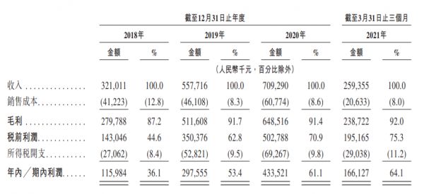 于往绩记录期间,爱美客的收入从2018年的3.21亿元增至2020年的7.09亿元,年复合增长率为48.6%。收入从截至2020年3月31日止三个月的7920万元增至截至2021年3月31日止三个月的2.59亿元,增长了超过两倍。