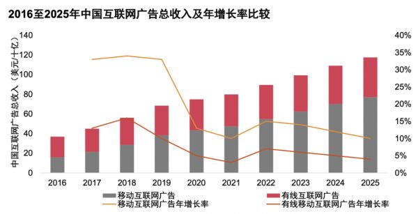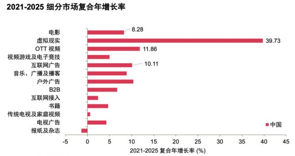 普华永道预计2021年中国娱乐及媒体行业总收入约为3586亿美元,至2025年收入将达约4368亿美元,这未来五年的复合年增长率为5.1%,高于全球的4.6%。其中,VR、OTT视频(包月视频订阅和按次付费点播)以及互联网广告等细分领域,中国的平均增速将领先全球。