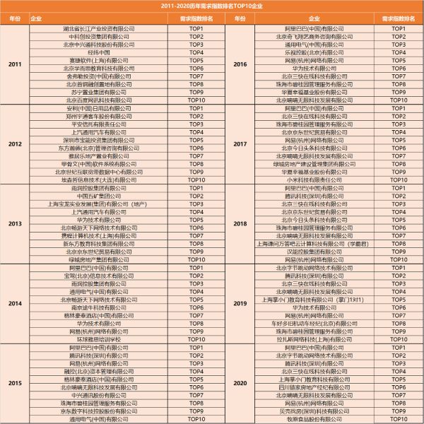 根据猎聘发布的《中国人力资本生态十年变迁白皮书(2011-2021)》显示,从过去十年猎聘平台上的公司需求指数排名前十的情况来看,2011、2012年以各类传统行业的公司为主,2013年上榜公司比较多元化,前十公司涵盖了矿业、投资、汽车、通信、互联网、教育等领域。直至2014年,阿里开始登上人才需求指数榜单第一,此后至2020年连续几年基本上都是位居前列。