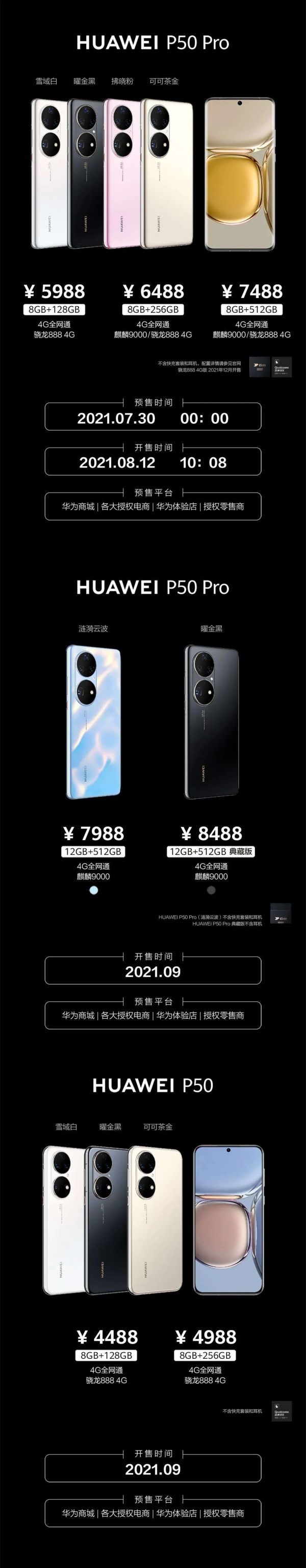对于外界关注的售价方面,据华为中国官方微博消息称,华为P50起售价4488元,华为P50 Pro起售价5988元。