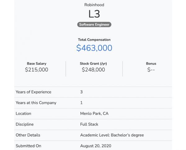 而如果你错过了早班车,能赶在最后一轮融资时加入Robinhood也是一样狂赚。另一位有着3年经验的工程师在去年8月加入Robinhood,当时Robinhood刚完成最后一轮融资估值为110亿美元。不到一年的时间,他所持有的24.8万美元/年的股票价值就已经顺利实现翻倍超过67万美元/年。