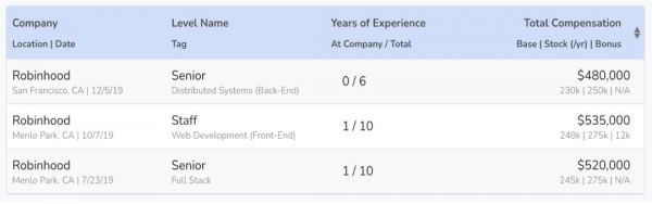根据招聘网站Levels.fyi显示,一个拥有十年工作经验的Robinhood的Senior级别的工程师,在2019年7月加入时一年拿到的股票约为27.5万美元,当时Robinhood的估值约为56亿美元,而此时,如果按现在300亿的估值计算,他当年的一年的股票价值已经相当于如今的147.3万美元。