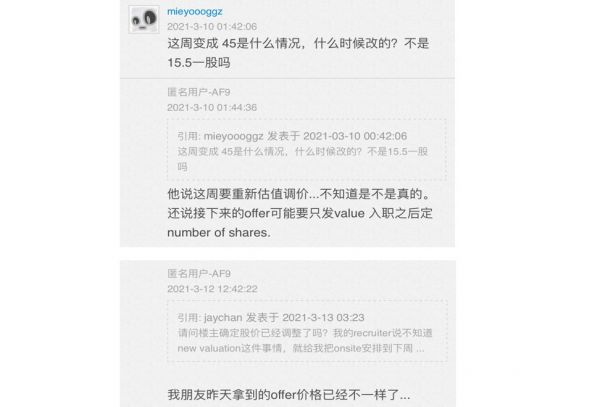 今年3月,有用户在北美华人工程师论坛——一亩三分地晒出了自己拿到的Robinhood最新入职包裹,并表示公司HR股权向他透露,之后入职员工的行权价将根据估值很快调整成成45美元一股,催促他赶紧接Offer。而此前按照Robinhood在去年8月最后一轮110亿美元的估值,公司给出的行权价格仅为15.5美元/股。也就是说,经历了疫情增长高峰之后,后入职的员工拿到的股权收入将比“老人们”少很多。