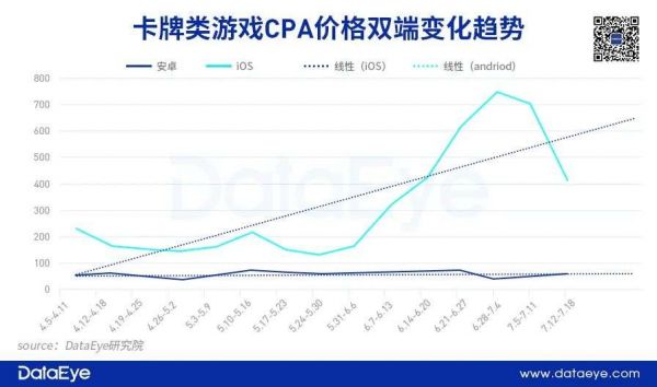 模拟经营类游戏进入四月以来,ios端的CPA价格一再降低,最低峰时为63.29元,而女性向游戏在4月初ios端CPA价格出现一个小高峰,此后也继续下降,6月中下旬至7月初有所回升,但从线性预测曲线走向看,ios端的价格依旧在下降。