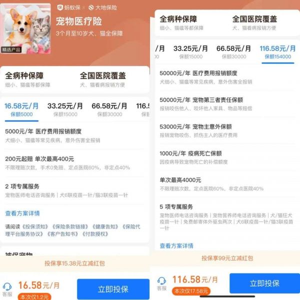 蚂蚁保和大地保险合作推出了一款宠物医疗险,最便宜的每月16.58元,最贵的每月116.58元,算下来每年在宠物保险上的花销少则近百元,多则上千元。