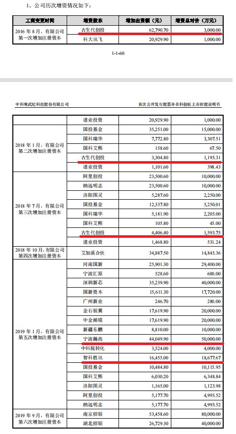 寒武纪招股说明书显示,古生代创投进入较早,其2016年8月就出资3000万元,获得了寒武纪6.25%的出资比例;2017年1月,寒武纪第二次增加注册资本的时候,古生代创投再度增资1195.3125万元,出资比例增至6.28%;2018年7月,寒武纪第二次增加注册资本的时候,古生代创投继续出资1593.75万元,出资比例降至6.25%。