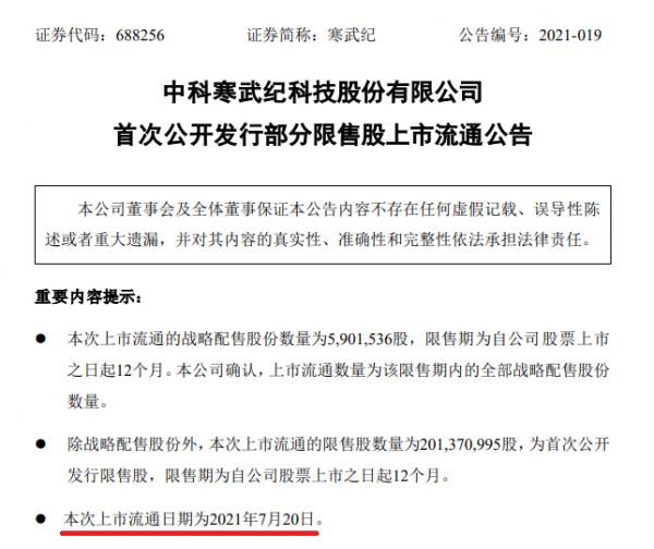 2021年7月20日,寒武纪上市满1年,合计约20727.25万股(占总股本的51.81%)限售股开始解禁,其中:战略配售股东有3名,持有590万股,占比1.47%;IPO首发限售股有20137.10万股,占比50.34%。