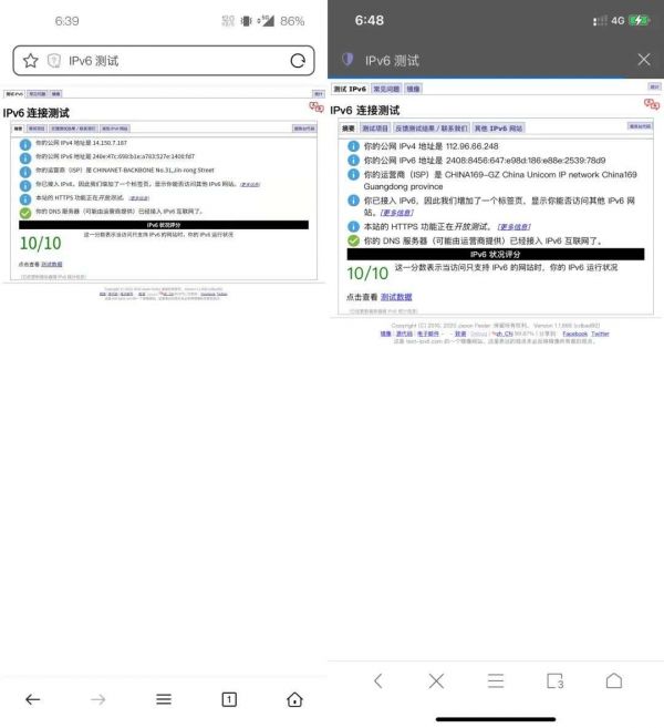 至于4G或者5G网络,现在三大运营商也基本有支持,基本默认状态下就能支持IPV6。小雷找来一台插电信卡的安卓机和一台插联通卡的iPhone,蜂窝网络下,测试均可以解析IPV6。