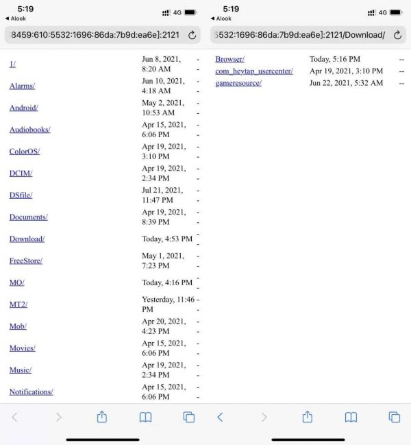 实际测试后,我们发现,另外一台同样用移动数据网络的手机,在浏览器输入开启FTP服务的安卓机的IPV6地址后,成功连接上,并且可以正常访问其文件系统。这也就说明,如果我们的电脑或手机接入了IPV6网络,其他设备可以实现公网直连,能应用在NAS外网连接、游戏远程直连乃至搭建小型服务器等应用场景下。