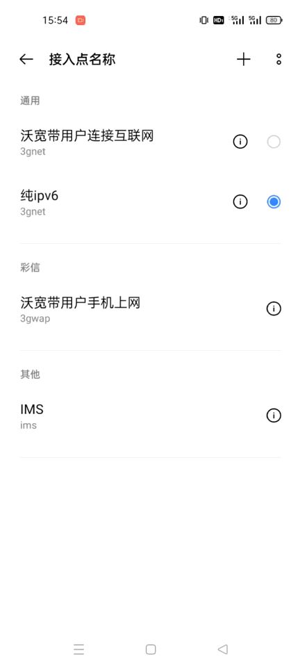 小雷发现,默认设置下,手机卡的APN连接点才有的是IPV4/IPV6双栈模式,为了测试得更彻底一点,小雷新建了一个纯IPV6的APN。