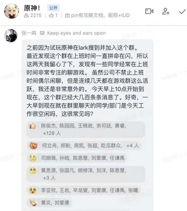 张一鸣在原神飞书群内的发言
