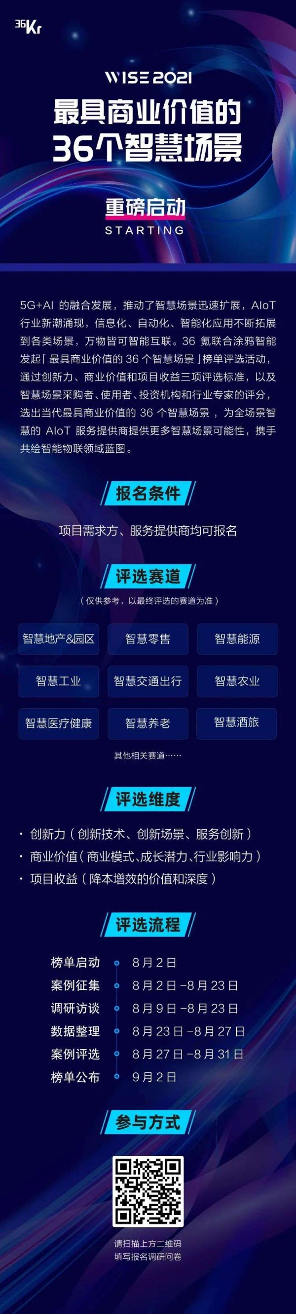 在这样的大背景下,36氪将联合国际化IoT企业涂鸦智能,发布「最具商业价值的36个智慧场景」榜单。 榜单内容将会在今年9月由36氪举办的「企业新浪潮·企业服务行业峰会」上发布。
