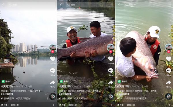 这样极富戏剧性的钓鱼场面在抖音上正当红。话题“#钓鱼”在抖音上有超692.8亿次播放,143.7万个视频。2021年1月发布的《2020年抖音数据报告》显示,过去一年,户外钓鱼成为抖音用户最爱的休闲运动,相关视频获赞超过8亿次。