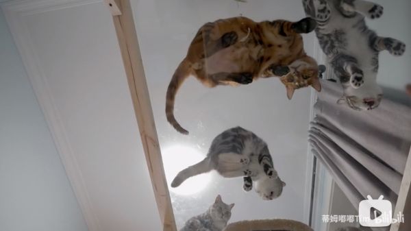 在他最近的一期视频里,他制作了高空全透明猫床。一张上下铺的木架床,但是把上层的床板换成了钢化玻璃。如此,蒂姆嘟嘟就能够躺在床上,透过玻璃,看见蹲坐其上的猫猫。稀奇古怪的创意让这期视频的播放量超过 70 万,点赞超过 8 万,全站最高排名第 96 位。
