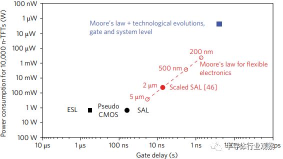 与硅基CMOS电路目前已经接近摩尔定律的瓶颈不同,柔性集成电路目前还处于摩尔定律发展曲线的初期,因此未来无论是集成度、性能还是功耗方面都可望会有很大的提升空间。根据欧洲顶尖半导体研究机构IMEC在《自然·电子学》发表的柔性集成电路的展望论文《The development of flexible integrated circuits based on thin-film transistors》,当未来的柔性集成电路的特征尺寸发展到200nm左右(即目前主流1um左右特征尺寸的五分之一到十分之一)时,其电路性能可望达到目前的20倍以上,而功耗则可以达到目前的一百分之一。到那个时候,我们可望可以看到功能更强大的柔性集成电路SoC(包括传感、处理和通信系统),从而真正赋能下一代“万物智能”时代,让智能化走入所有日常物件。