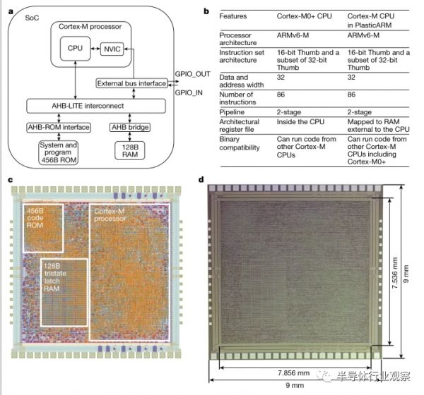 首先,该ARM处理器的完成度和复杂度非常高。它基于ARMv6-M架构外加两级流水线,可以直接跑兼容Cortex-M0的程序。在模块方面,它事实上是一个SoC,除了CPU之外,还包括了互联接口(AHB-Lite)、ROM和RAM。其等价逻辑门数高达18000,比前述的由上千个TFT组成的柔性集成电路的规模大了一个数量级。处理器的时钟频率可以达到29KHz,功耗则为21mW。