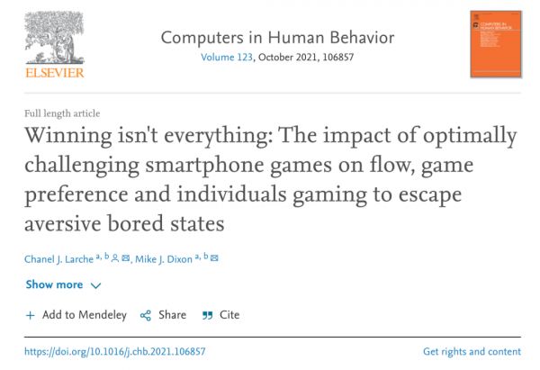 相关研究论文以 “Winning isn't everything: The impact of optimally challenging smartphone games on flow, game preference and individuals gaming to escape aversive bored states” 为题,已于近期发表在 ScienceDirect 上。滑铁卢大学认知神经科学博士 Chanel Larche 与认知神经科学教授 Michael Dixon 共同完成了这项研究。