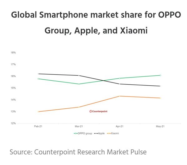 报告显示,2021年5月,OPPO家族全球智能手机市场份额为16%,在全球智能手机市场中排名第二;其次是苹果,市场份额为15%,小米以14%的市场份额位居第四。