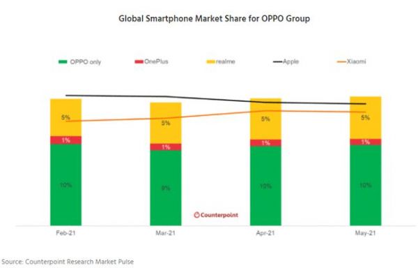 因为我们可以看到CounterpointResearch报告中的数据是OPPO集团,也就是包括OPPO、一加和realme三个品牌的全球市场份额,而三个品牌均归属于欧加集团,而非OPPO。即便是一加已经归于OPPO旗下,但那也是6月的事情,所以5月份的数据应该用“欧加集团”描述更为准确。