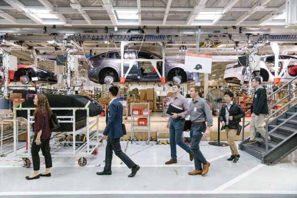 人们参观特斯拉位于加州弗里蒙特的工厂。随着2018年第三季度接近尾声,工人正努力实现马斯克的生产目标。