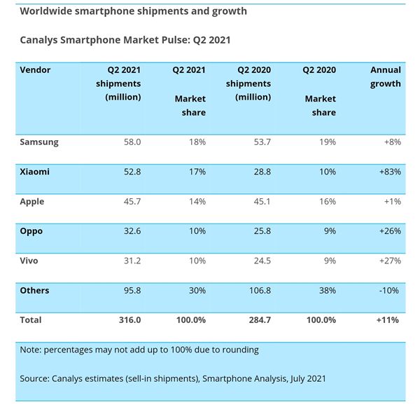 Canalys2021第二季度报告:小米手机销量全球第二 图源:Canalys