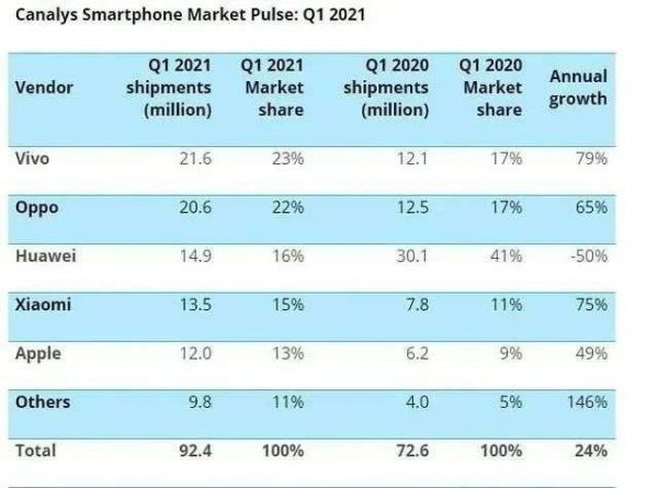 2021年第一季度,华为手机市占率为16%,而vivo、OPPO及小米手机销量则分别上涨79%、65%和75%。去年同期,华为手机市场占有率曾达到41%,如今这份曾接近市场一半的份额正被各家蚕食,消失了25%。