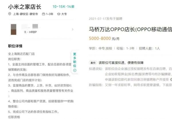 boss直聘招聘数据显示,小米之家店长一职在上海薪酬范围为10k~15k,而在猎聘招聘平台,一条发布于7月17日的上海OPPO店长招聘信息则显示,OPPO为店长一职开出的薪酬范围为5k~8k。