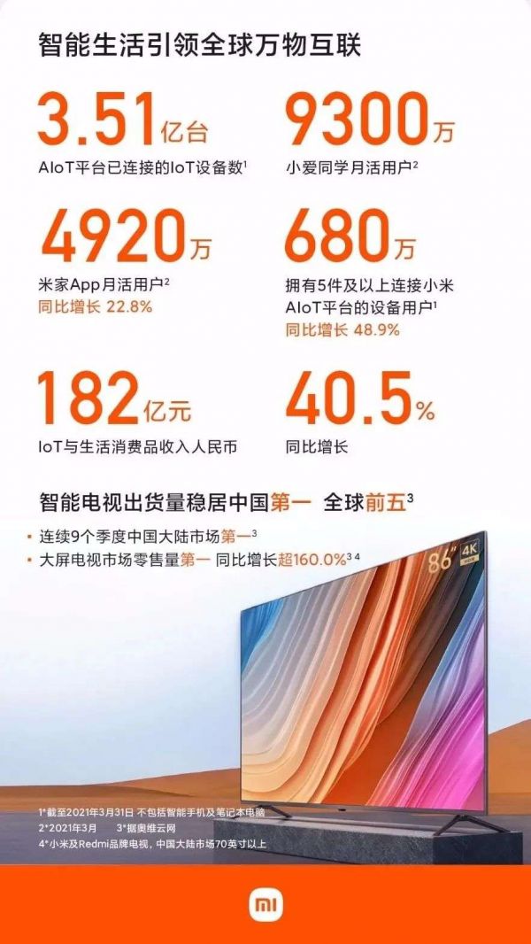 小米2021年第一季度财报显示,截至3月31日,拥有5件以上连接至小米AIoT平台设备的用户数已达680万。