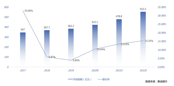 2017年-2022年中国工业机器人市场规模及预测,数据来源:赛迪顾问,采访供图