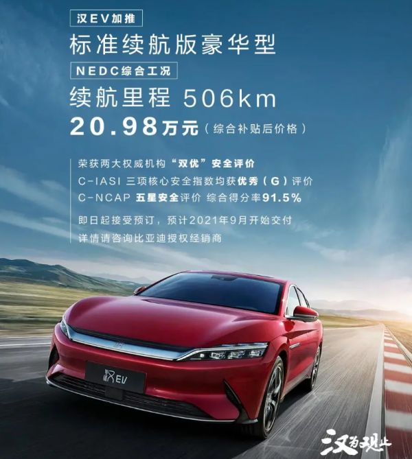 根据目前比亚迪公布的信息显示,汉EV标准续航版豪华型的补贴后售价为20.98万元,NEDC综合工况续航里程为506km,新车将会在9月份开始交付。新车型相较于此前最低配比亚迪汉EV超长续航版豪华型价格降低了2万元,续航里程减少了99km。