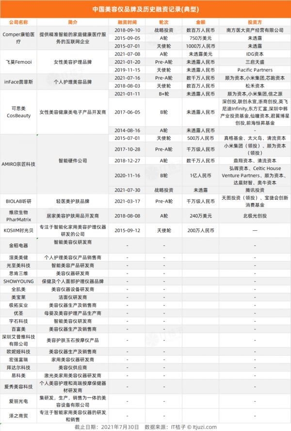 IT 桔子汇总信息显示,目前有超过 8 个国产美容仪品牌获得了投资。投资方方面,除了小米集团、顺为资本、IDG 资本、清流资本、天图投资等知名 VC 也已经入局。