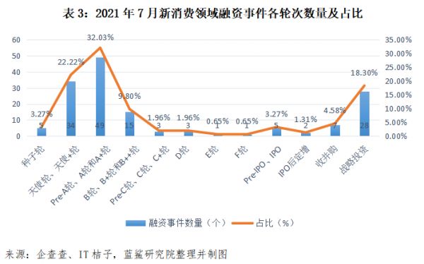 据蓝鲨研究院不完全统计, 2021 年 7 月 1 日至 7 月 31 日,国内新消费领域投融资事件共计 153 起。 其中,透露融资金额的项目 112 起; 亿元级融资项目 42 起,集中于餐饮、跨境电商两个细分领域,社区团购赛道昔日头部玩家出局、兴盛优选再次拿到巨额融资。
