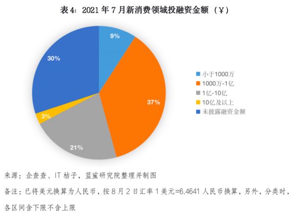 从融资金额看,千万元级别投融资项目占比最高,占比超过1/3。在153起投融资事件中,近1/3的项目未公布融资金额,有107起公布了融资金额。其中,37%的项目的融资额度超过1000万元小于1亿元;21%的项目在1亿至10亿之间;9%的融资额度不到千万级;融资金额超过10亿的项目则有4个,分别是美维口腔、兴盛优选、喜茶和PatPat,三者在7月份分别获得了超10亿人民币、3亿美元、5亿美元和5.1亿美元。