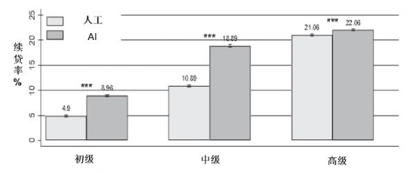 实地实验中,429名销售员随机分配给人类或AI教练。总体而言,AI教练的表现全面超越人类教练,经验不等的三类销售员在AI辅导下都取得了业绩进步。令人惊奇的是,进步最大的群体是中级销售员,而不是初级销售员。以下是经过辅导后的三类销售员续贷率的比较。